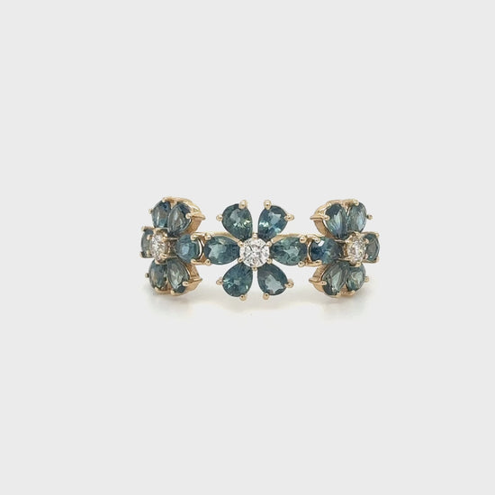 14K FLOWER RING WITH SAPPHIRE AND DIAMONDS