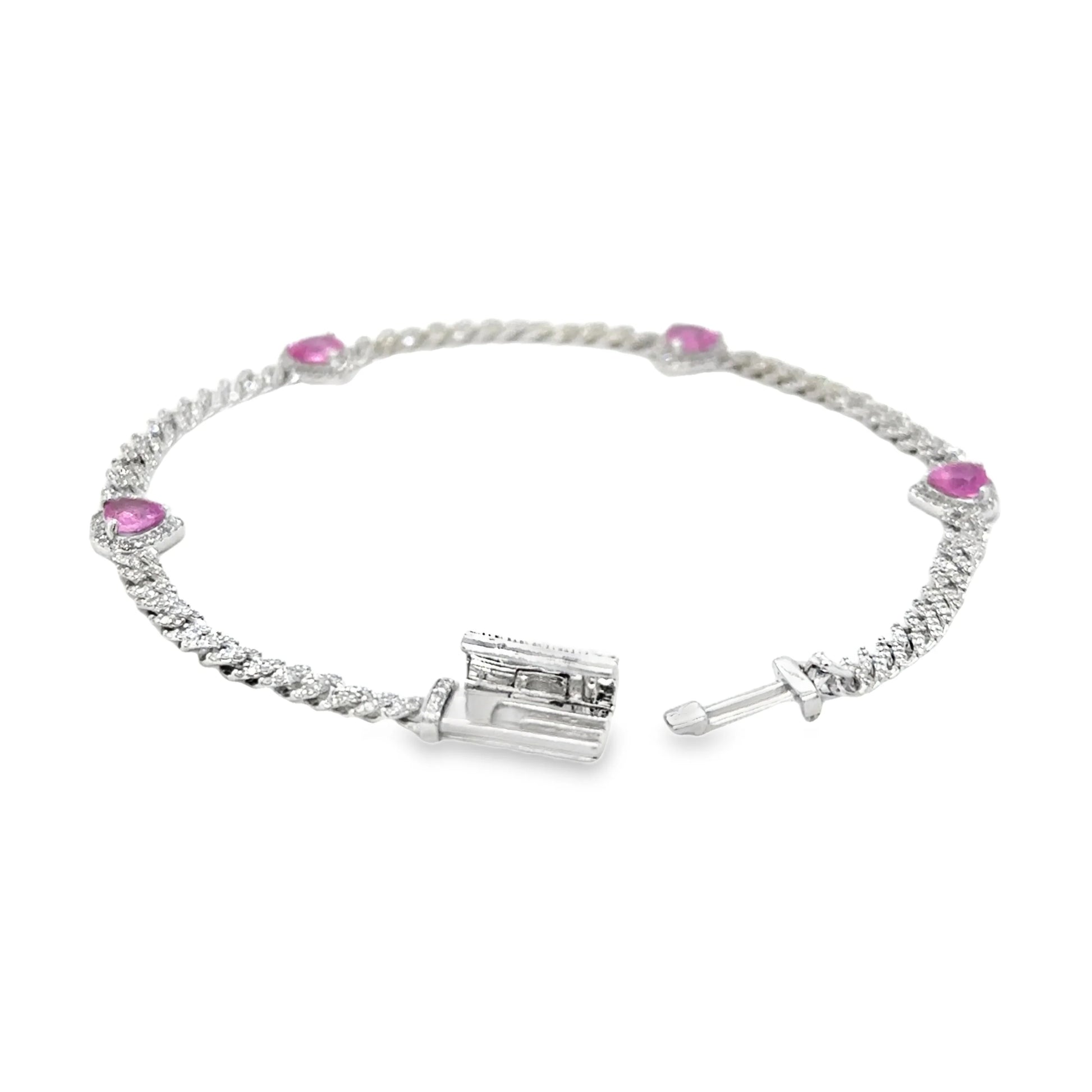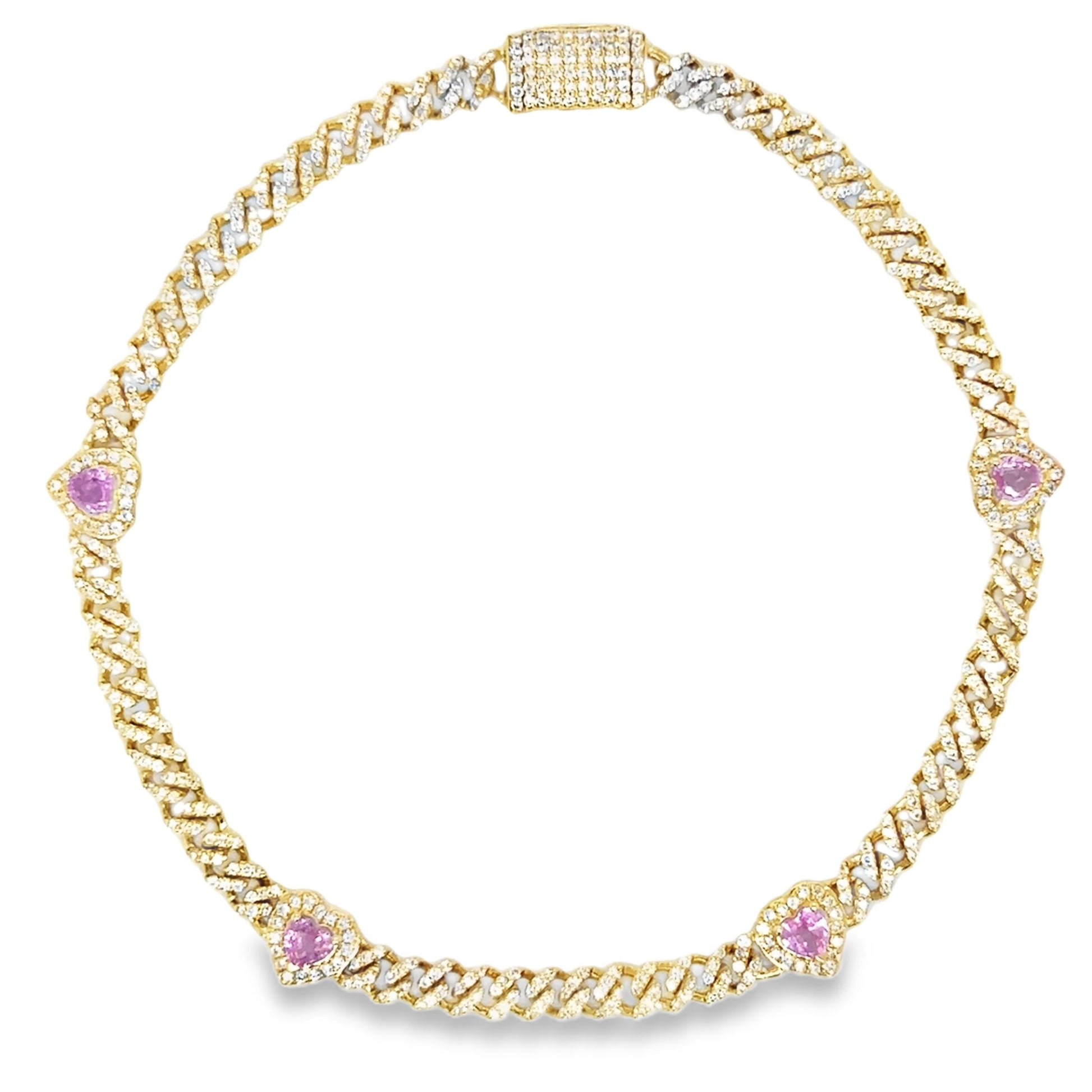 14KT GOLD PINK SAPPHIRE AND DIAMONDS HEART CUBAN BRACELET
