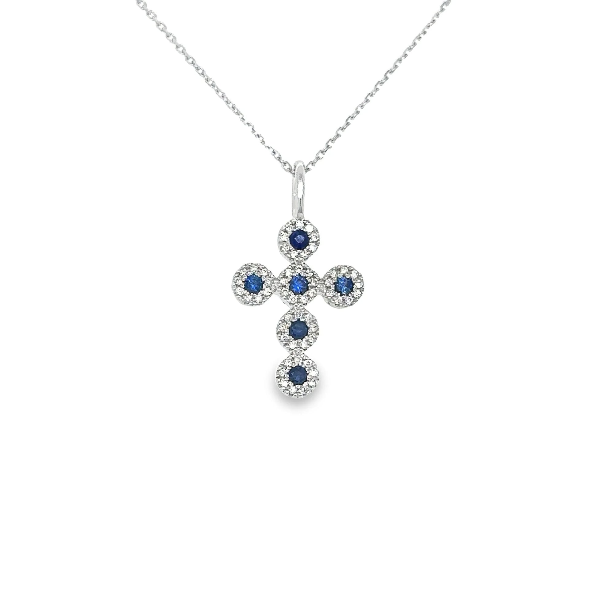 14KT WHITE GOLD AND GOLD CROSS PENDANT BLUE SAPPHIRE AND DIAMONDS