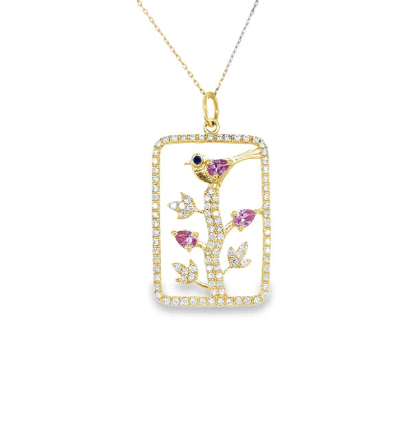 14KT YELLOW GOLD CLEAR QUARTZ BIRD PENDANT WITH PINK SAPPHIRE AND DIAMONDS