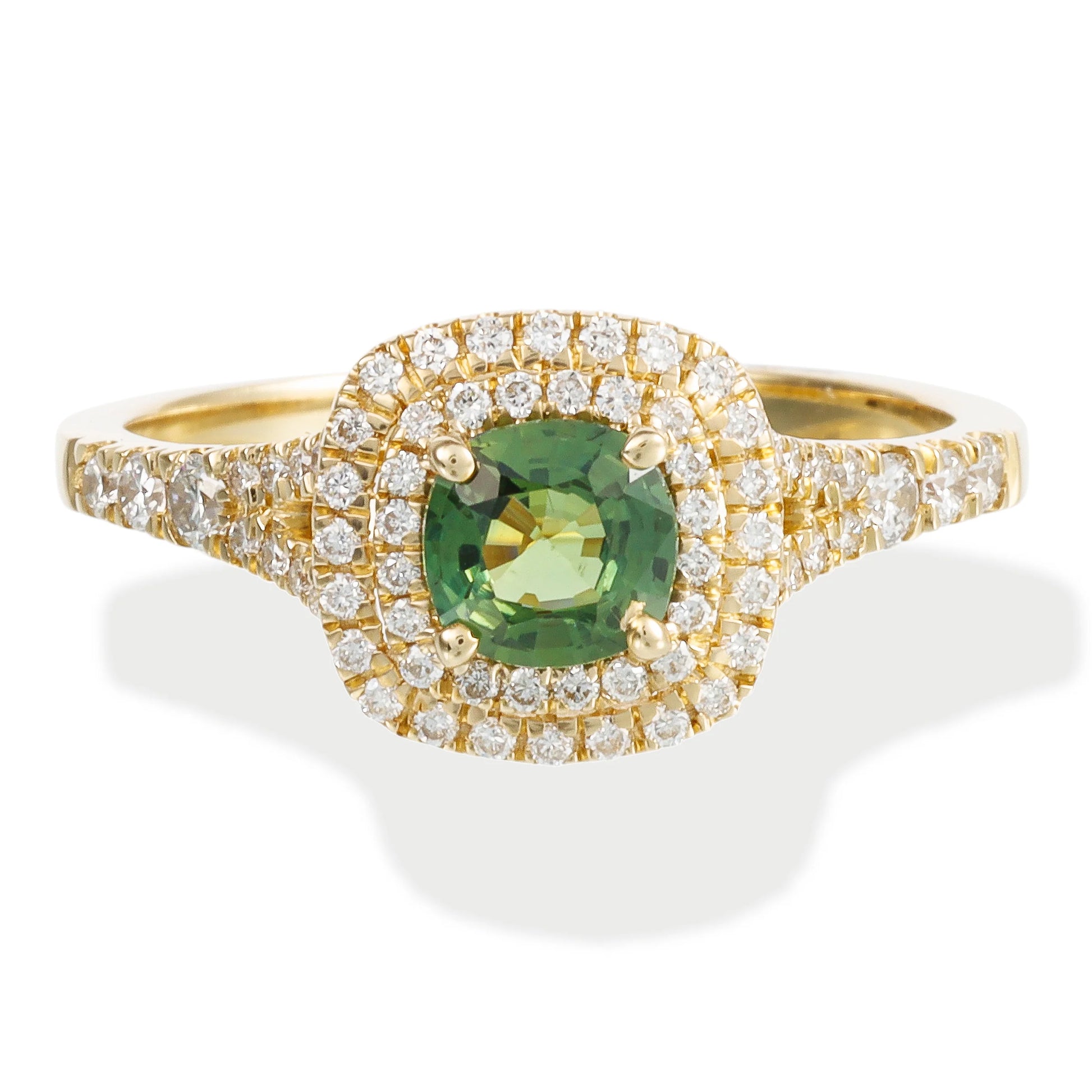 14KT YELLOW GOLD DIAMOND & GREEN SAPPHIRE CUSHION SHAPE RING