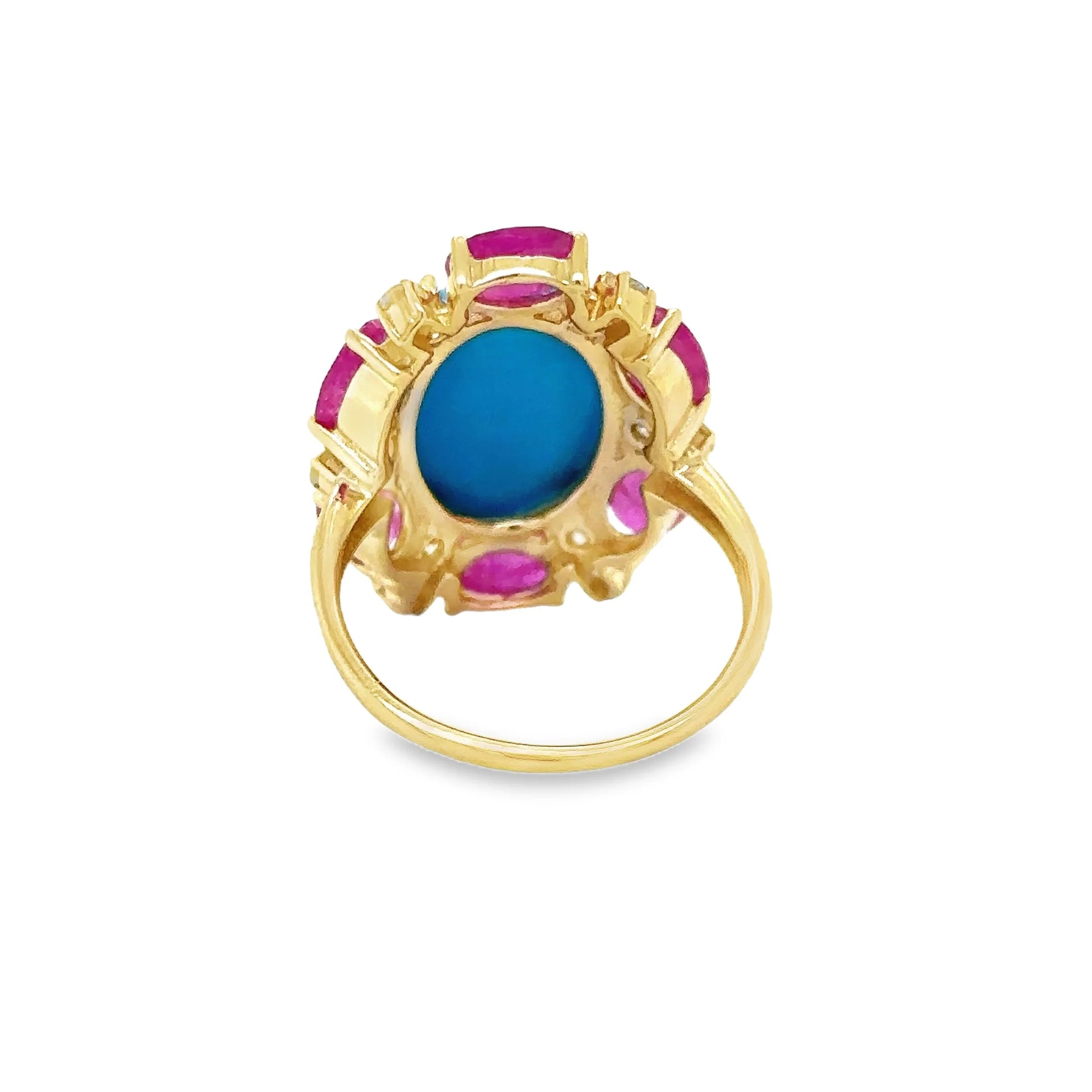 14KT YELLOW GOLD RUBY, TURQUOISE AND DIAMOND RING