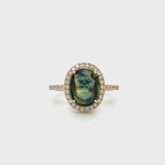 14KT YELLOW GOLD TILT SAPPHIRE RING WITH DIAMONDS
