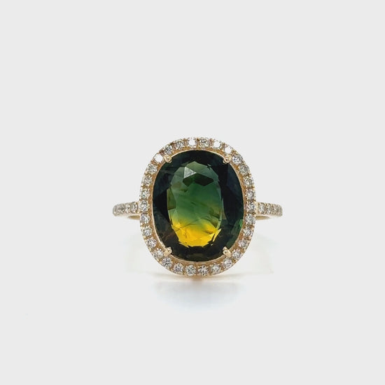 YELLOW GOLD TILT SAPPHIRE RING WITH DIAMONDS